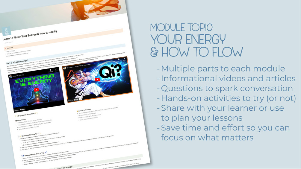 A Notion page with a multi-part lesson plan to help you teach kids and teens about their energy (a.k.a. prana, life force, Qi, chi). Includes resource, questions, and activities.